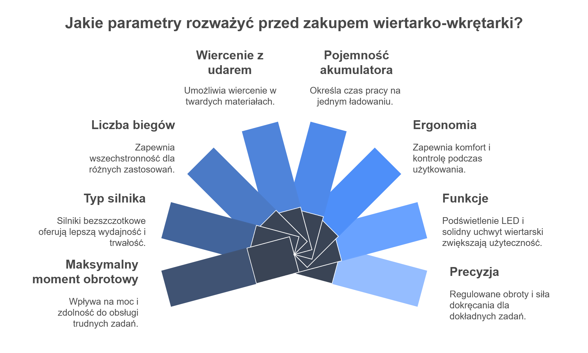 Najważniejsze parametry to: moment obrotowy, pojemność akumulatora, liczba biegów, obecność udaru, waga urządzenia, typ silnika (bezszczotkowy), uchwyt wiertarski oraz dodatkowe funkcje – np. oświetlenie LED, zabezpieczenia przeciążeniowe, wskaźnik poziomu baterii.