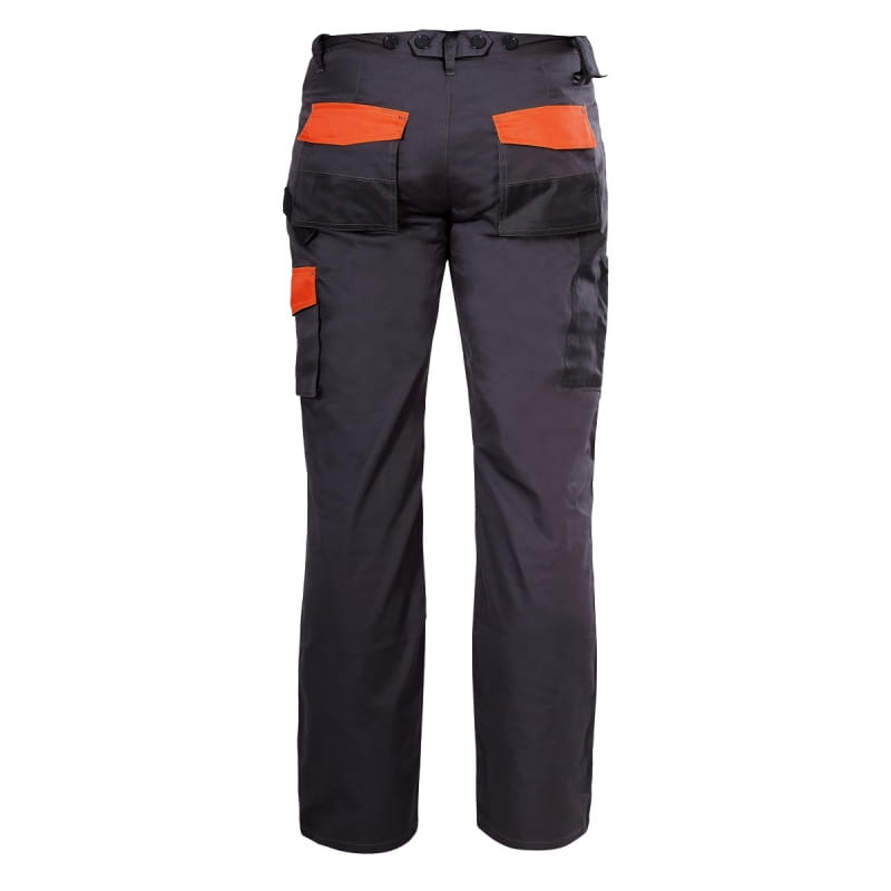 Spodnie robocze do pasa L40503. Spodnie z najnowszej kolekcji marki Lahti Pro. Ogrodniczki wykonano z materiału o gramaturze 190 g/m2 (35% bawełny, 65% poliester) w kolorze szarym z czarno-pomarańczowymi wstawkami. Spodnie posiadają 9 kieszeni w tym 6 zapinanych na rzep, kieszeń na telefon komórkowy. Potrójne szwy. Regulacja szerokości w pasie za pomocą guzików. Dodatkowo ogrodniczki posiadają oczko na klucze oraz szlufkę na młotek. Wzmocnione kieszenie oraz kieszenie na ochraniacze kolan materiałem 300D (poliester) odpornym na przetarcia. Możliwość dokupienia ochraniaczy kolan model LPN001. Spodnie są w pierwszej kategorii środków ochrony indywidualnej. Posiadają certyfikat CE oraz normę EN ISO 13688 międzynarodowa norma określa ogólne wymagania, dotyczące wykonania, z zakresu ergonomii, nieszkodliwości, oznaczania wielkości, procesu starzenia, kompatybilności i znakowania odzieży ochronnej oraz informacji, które powinien dostarczać producent wraz z wyrobem. Niniejsza Norma Międzynarodowa jest przeznaczona do stosowania tylko w połączeniu z innymi normami określającymi wymagania dla konkretnego wykonania i nie może być stosowana jako samodzielny dokument bazowy. Kategoria I - produkty należące do tej kategorii zapewniają podstawowy poziom ochrony przed działaniem czynników zewnętrznych niskiego ryzyka, których skutki są powierzchniowe, chroniąc przed np. drobnymi skaleczeniami, otarciami, zabrudzeniami, działaniem łagodnych środków czyszczących, czynnikami atmosferycznymi o charakterze łagodnym itp.