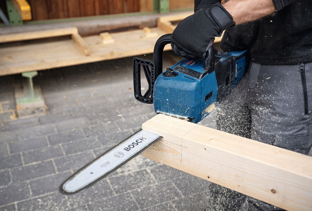 - Prowadnica o długości 40 cm umożliwia ciągłe cięcie belek, drewna i grubych gałęzi, dzięki czemu jest to idealne narzędzie do wielu różnych prac