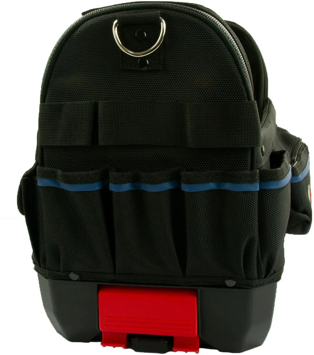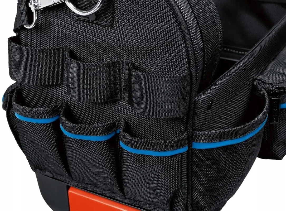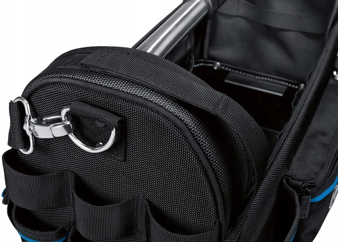 - Metalowy zaczep na zewnątrz torby do zamocowania narzędzi wyposażonych w zaczep do paska