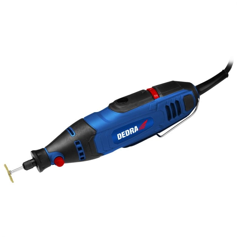 Miniszlifierka to jedno z popularnych narzędzi, którego z całą pewnością nie może zabraknąć w domowym warsztacie lub u domowego majsterkowicza. Zwięzła konstrukcja o podłużnym kształcie przywodzi na myśl szlifierki proste tzw. prostnice. Wygodny, gumowany uchwyt pozwala na pewne trzymanie narzędzia. W zestawie nie mogło zabraknąć takich akcesoriów jak giętki, elastyczny wałek napędowy, liczne końcówki robocze, takie jak tarczki tnące (separatory), papiery ścierne, krążki ścierne, filce polerskie, kamienie szlifierskie, frezy diamentowe, wiertła HSS oraz elementy pozwalające na ich mocowanie. Szlifierka zasilana jest z popularnego gniazdka 230V. Wydajny, wysokoobrotowy silnik o mocy 135W, ma regulowaną prędkość obrotową w zakresie 10000-32000obr/min.