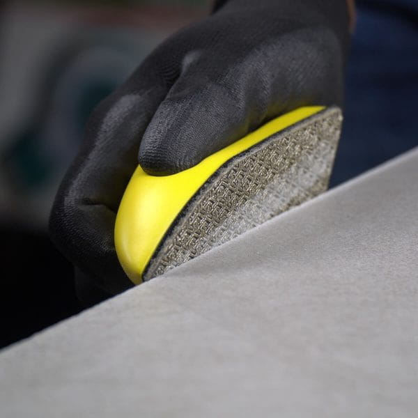 Ręczne szlifowanie skomplikowanych powierzchni. Przy cięciu płytek ceramicznych często konieczne jest usuwanie wiórów z ciętej krawędzi. Odbywa się to zwykle za pomocą elastycznych tarcz polerskich za pomocą szlifierki kątowej. Ręczne ściernice diamentowe HAND PAD PRO umożliwiają ręczne szlifowanie krawędzi bez użycia szlifierki kątowej. Pozwala to szybko przejść z cięcia na szlifowanie. Pasek jest kompaktowy, zawsze wygodniej jest mieć go pod ręką. Kierownica posiada bazę diamentową z ziarnistością #120 osadzoną na podeszwie. Dostępne są również wymienne bazy z ziarnami # 60 i # 200. Podstawy montuje się za pomocą tekstylnego „rzepu”. Podstawki mają zaokrąglony kształt, co jest bardzo wygodne przy szlifowaniu trudno dostępnych miejsc, takich jak wewnętrzne narożniki płytki, wewnętrzne krzywizny promieniowe. Sam drążek ma miękki ergonomiczny kształt w postaci żelazka, które bardzo wygodnie leży w dłoni.