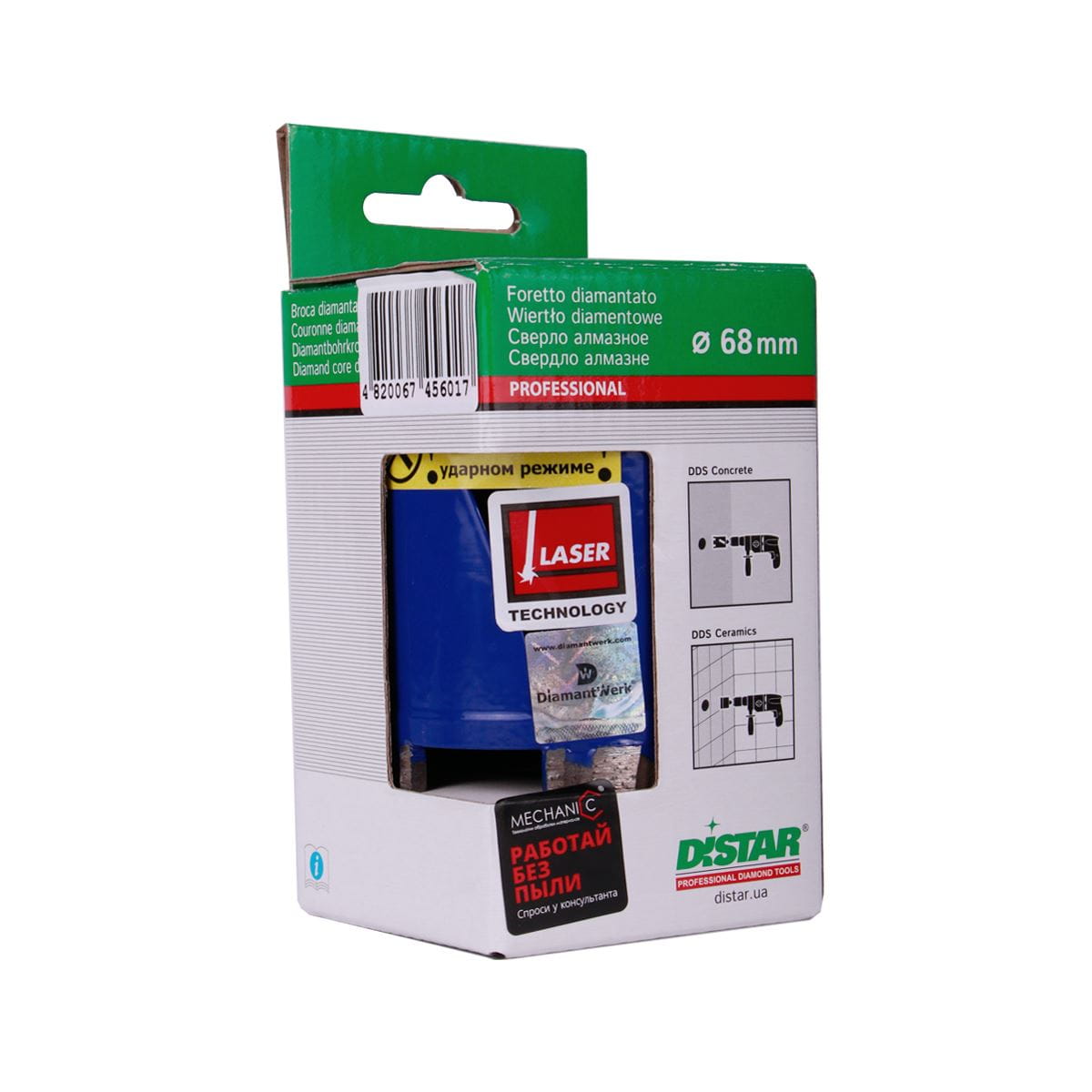 - Wiertła diamentowe segmentowe Distar DDS-W Beton Magnet przeznaczone są do wiercenia głuchych otworów pod gniazdka w ścianach murowanych, ze zbrojonego i słabo zbrojonego betonu bez użycia chłodziwa. Wiertła są produkowane o średnicach 68, 72, 82. DDS-W mają wewnętrzne gwintowane osadzające M16 i są wyposażone w centrujące wiertło z węglika spiekanego z adapterem M16/SDS Plus (do mocowania wiertła w uchwycie perforatora).