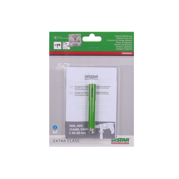 Korona diamentowa DISTAR DDR-B GRANITE ACTIVE jest doskonałym pomocnikiem do wykonywania otworów o różnych średnicach w powierzchniach ceramicznych. Najskuteczniej sprawdza się w pracy z miękkimi i twardymi płytkami ceramicznymi, a także marmurem i porcelaną. Podczas wiercenia tworzy schludną krawędź bez uszkadzania ogólnego wyglądu materiału. Korona prezentowana jest w różnych wariantach w zależności od średnicy, w szczególności od 6 mm do 46. Korona wyposażona jest w specjalny chwyt pod uchwytem, który umożliwia stosowanie narzędzia na wiertarkach ręcznych. Obowiązkowe warunki pracy to moc wiertarki od 600 W, obecność regulatora obrotów od 800 do 2000 oraz brak perforacji. Dzięki mocnej warstwie diamentowej możliwe jest osiągnięcie maksymalnej prędkości i zasobów wierteł. Podczas wiercenia wiertło i materiał muszą być chłodzone wodą.