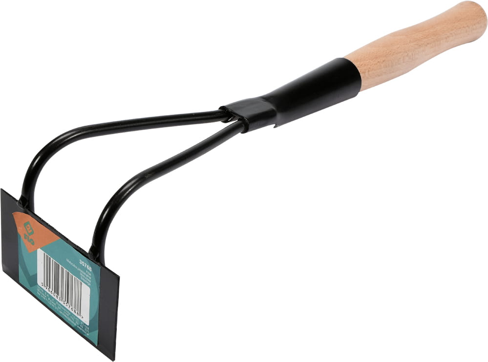 Metalowa motyczka o długości całkowitej 33 cm. Osadzona na krótkim, drewnianym trzonku. Część robocza zabezpieczona antykorozyjnie lakierem w kolorze czarnym. Przeznaczona do prac porządkowych i ogrodowych.