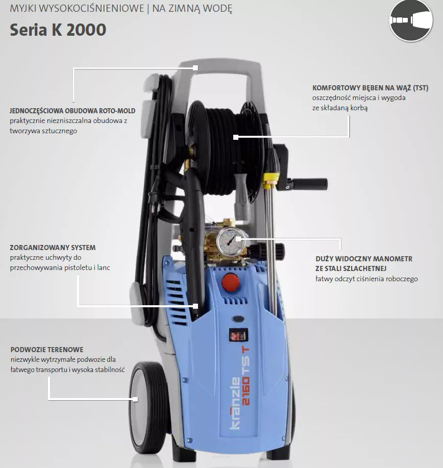 - Linia myjek Kränzle K 2000 jest perfekcyjnie dopasowana do różnych wymagań stawianych myjkom ciśnieniowym