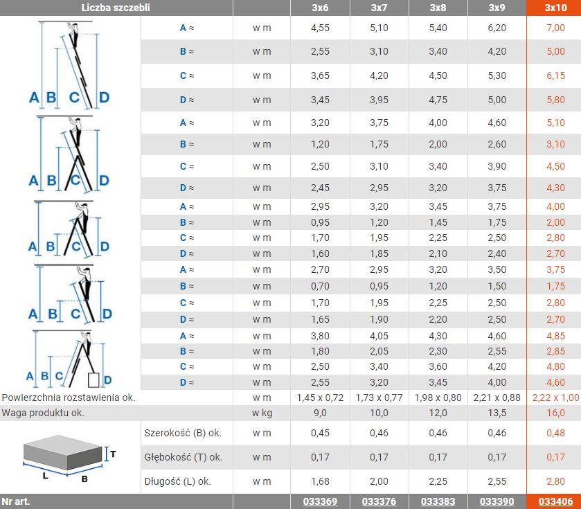 - Specjalne haki zapobiegające samoczynnemu złożeniu/rozłożeniu się drabiny podczas używania i transportu
