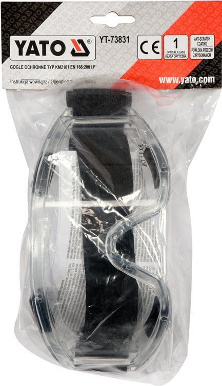 Gogle ochronne YT-73831 o panoramicznym kształcie szybki pokrytej powłoką przeciw zarysowaniom. Owalna konstrukcja z dodatkowymi zaworami wentylującymi zapewnia doskonałą widoczność i komfortowe przyleganie do twarzy. Klasa optyczna 1 - najwyższa jakość pola widzenia, polecane do pracy ciągłej. Materiał soczewek poliwęglan z powłoką anti-scratch przeciw zarysowaniom, materiał oprawy PVC, szeroki kąt widzenia. Regulowana taśma elastyczna umożliwia bezproblemowe dopasowanie gogli do twarzy. Cztery zawory wentylujące ograniczające parowanie gogli wewnątrz. Gogle uzyskały atest na wytrzymałość mechaniczną na poziomie F, czyli wytrzymują uderzenie stalowej cząsteczki o średnicy 6mm, masie 0,86g i prędkości 45m/s. Spełniają wymagania normy EN166.