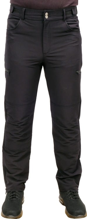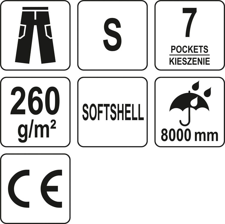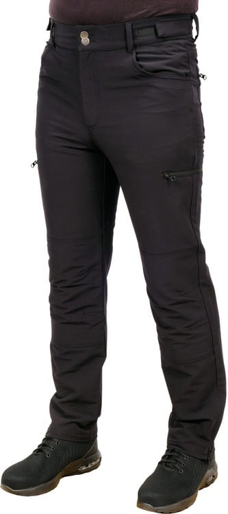 Spodnie robocze softshell z siedmioma kieszeniami, w tym 4 z zapięciem na zamek błyskawiczny zaprojektowano z myślą o komfortowej pracy w chłodniejsze dni. Materiał typu softshell o podwyższonej gramaturze, stworzony na bazie poliestru z dużą domieszką elastanu. Elastan poprawia rozciągliwość, sprawia że materiał jest przyjemny w odczuciu, a spodnie lepiej dopasowują się do ciała. Zewnętrzna warstwa zapewnia odporność na umiarkowany deszcz. Rozpinane nogawki ułatwią nałożenie na wysokie buty np. trzewiki. Wszyte taśmy z zapięciem na rzep do regulacji w pasie pomogą równomiernie dopasować spodnie do talii. Komfort noszenia zbliżony jest do spodni dresowych, natomiast materiał i jakość szycia gwarantują znacznie wyższą niż w spodniach dresowych wytrzymałość. Główne łączenia materiału za pomocą ściegu typu owerlok. Rozporek zapinany zamkiem błyskawicznym oraz dwa guziki w pasie. Podwójna warstwa materiału na kolanach. Rozpinane nogawki.