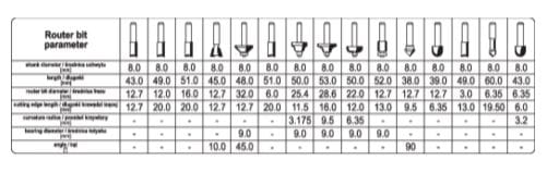 - Do obróbki drewna i materiałów drewnopochodnych przy użyciu frezarki z uchwytem fi 8 mm