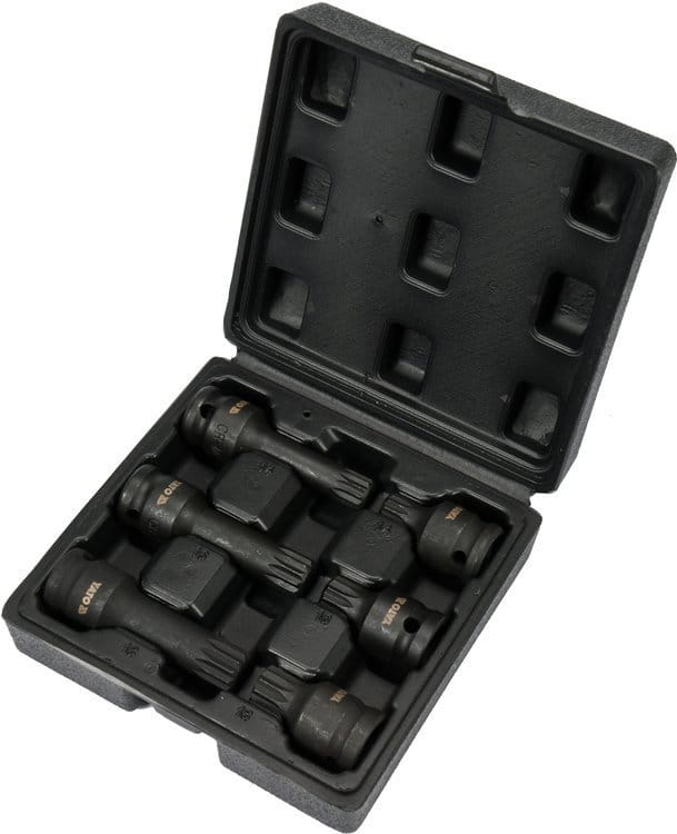 6-częściowy zestaw udarowych kluczy trzpieniowych Spline polecany do serwisów samochodowych i mechanicznych. Przeznaczony do pojazdów VW LT, Transporter, Sharan, Golf. Do stosowania z kluczami udarowymi, posiadają otwór stabilizujący mocowanie. Zapakowany w poręczną walizkę.